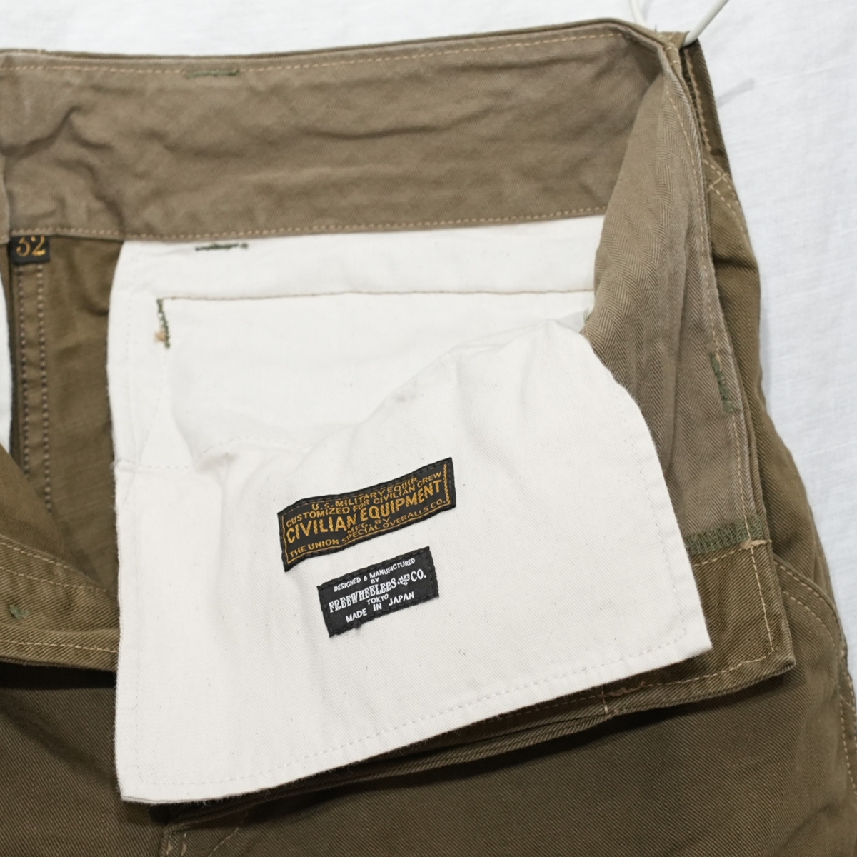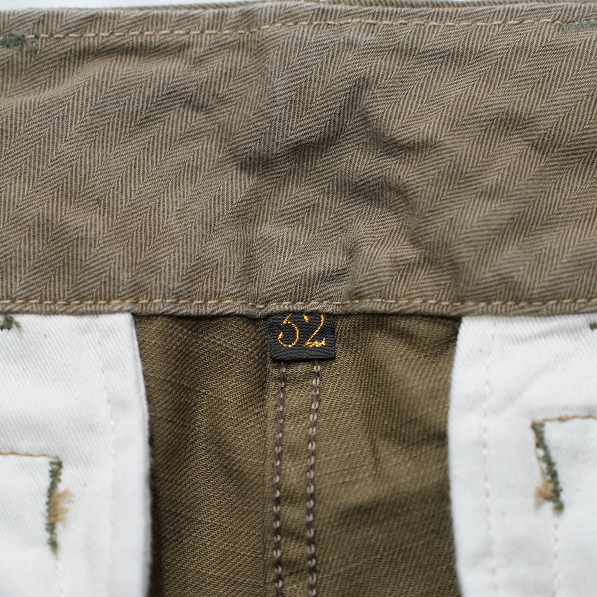 帯裏にヘリンボーンツイルが付き、バックセンターにはサイズタグも付きます。