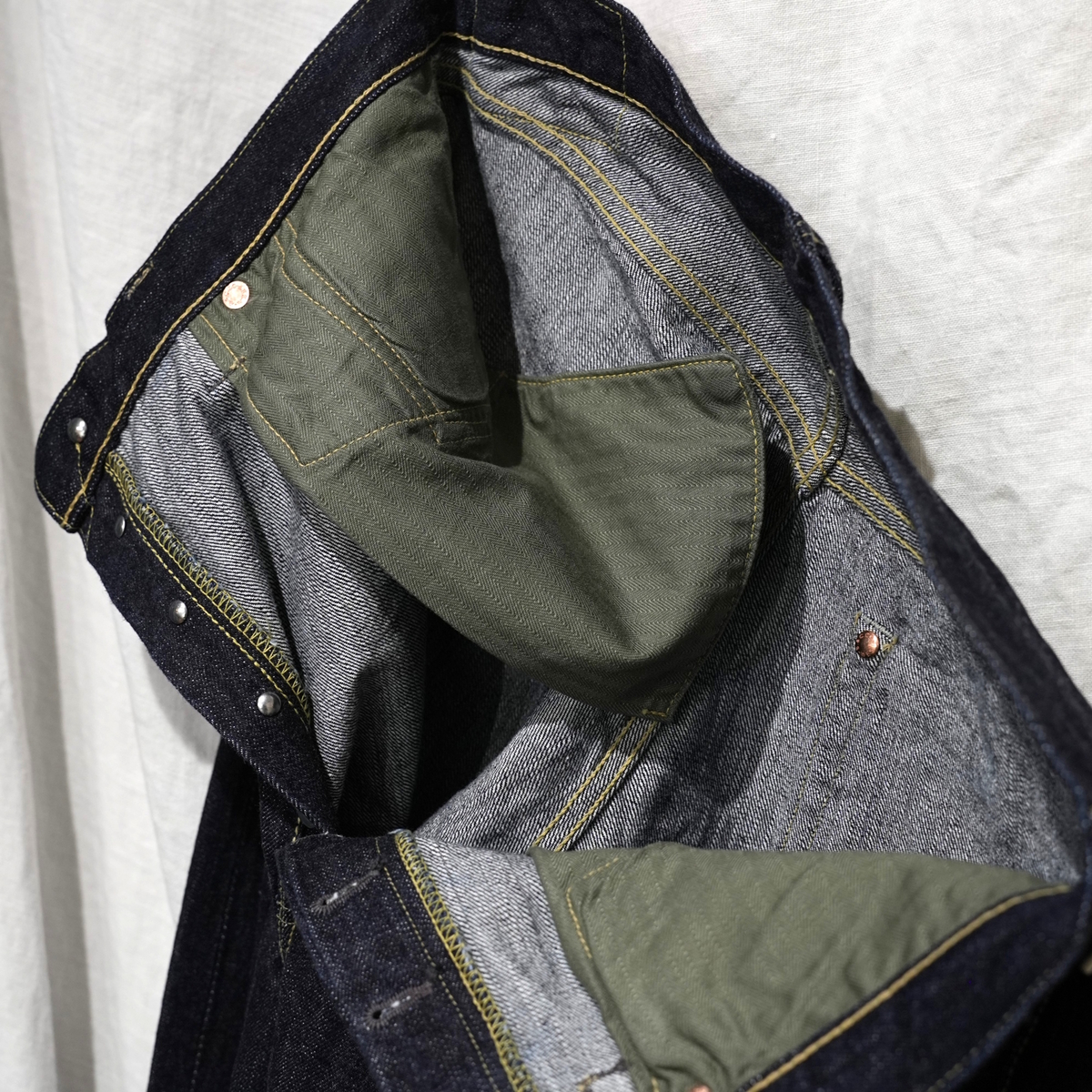 ポケットスレーキは、オリーブドラブのヘリンボーンツイル。