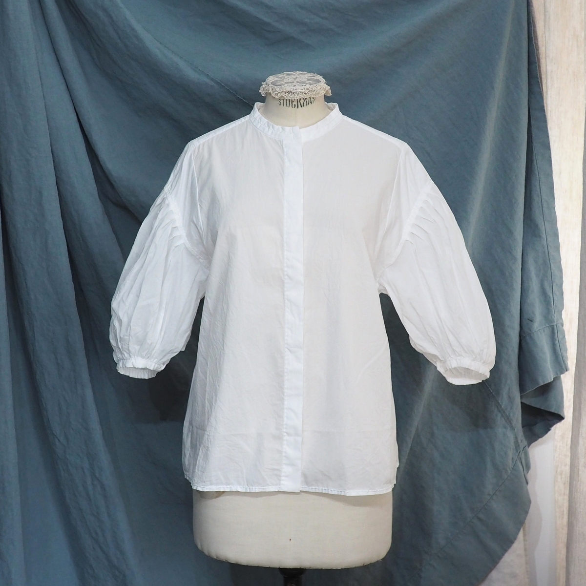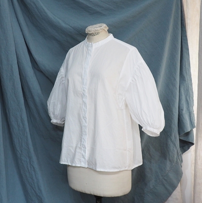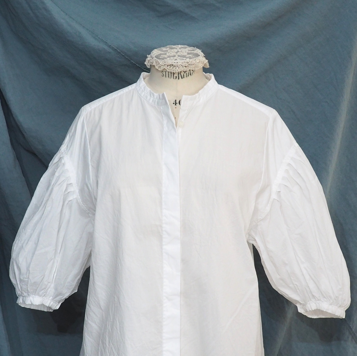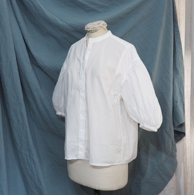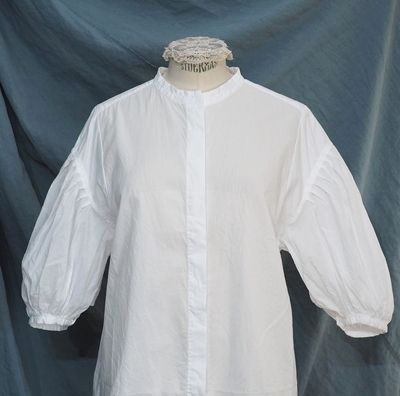 型は、パフスリーブが特徴の、スタンドカラー、比翼仕立てのブラウス。