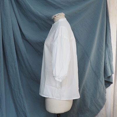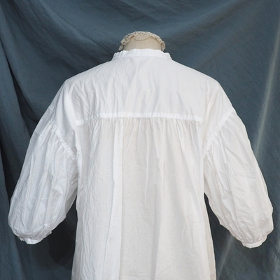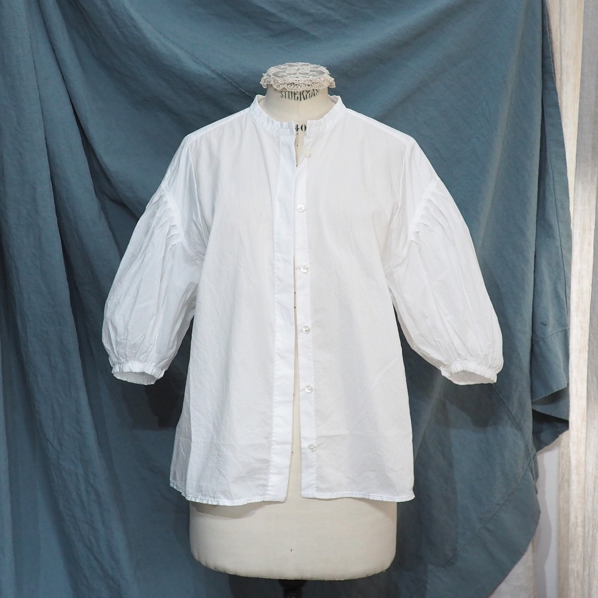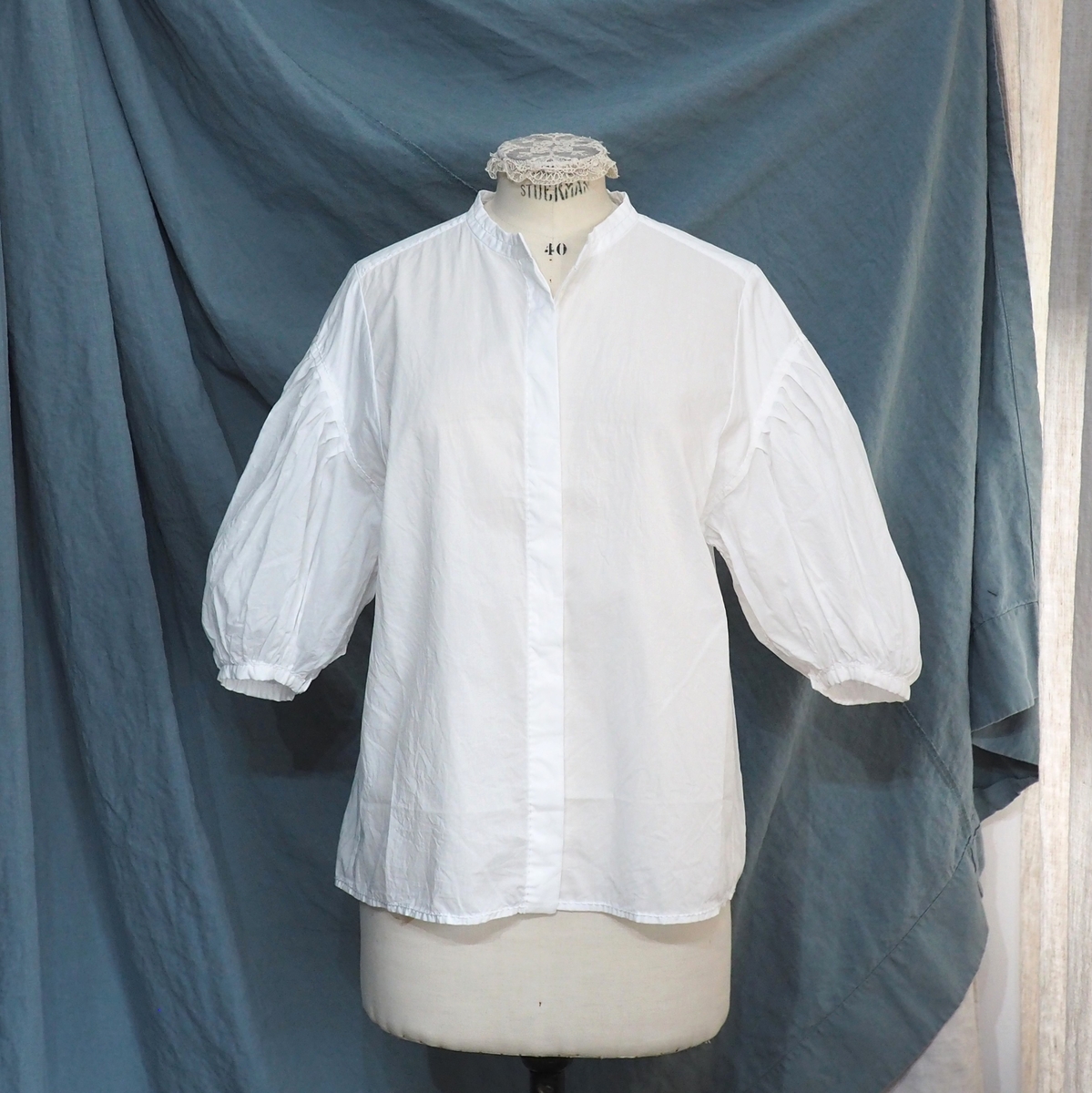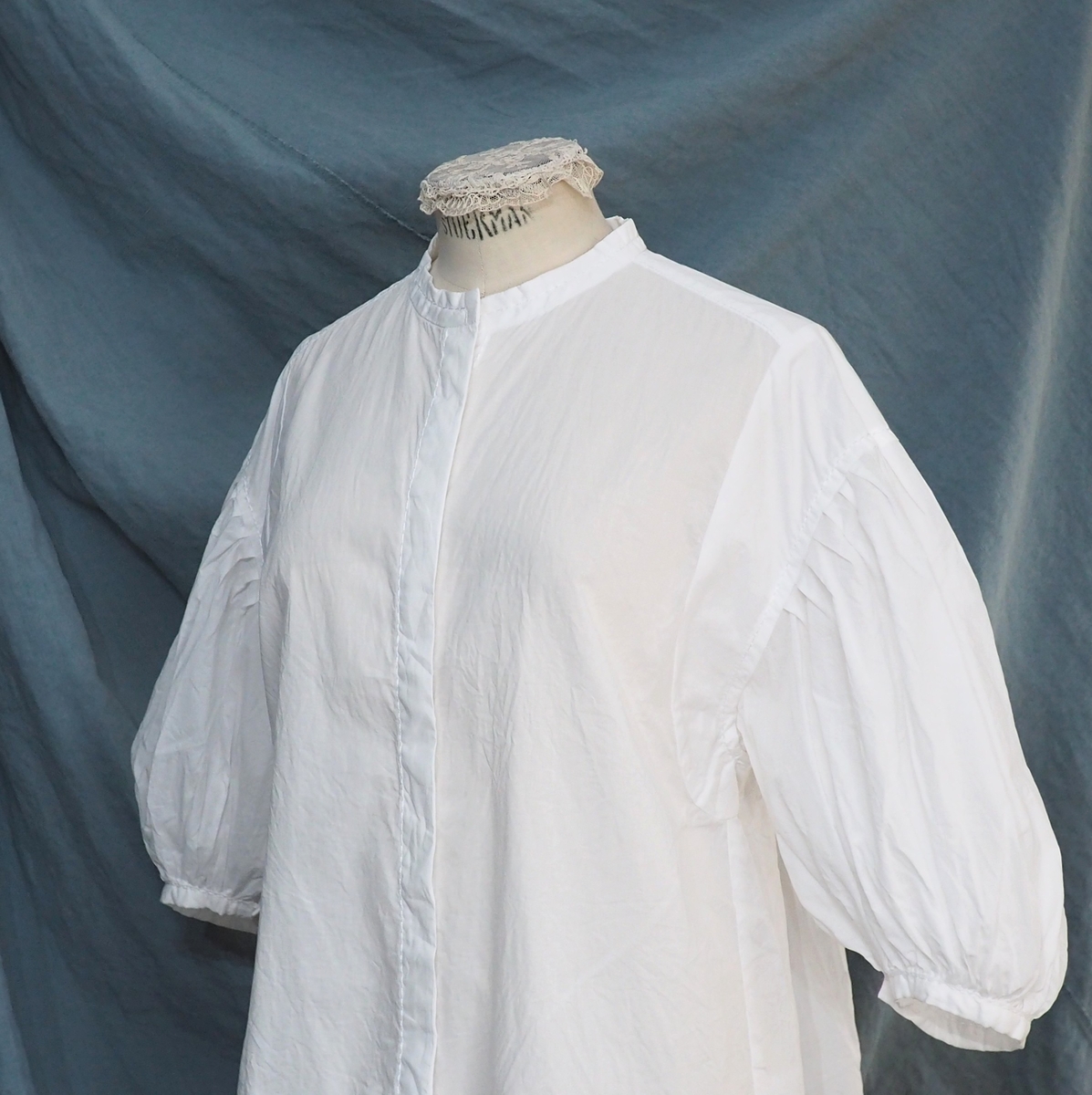 型は、パフスリーブが特徴の、スタンドカラー、比翼仕立てのブラウス。