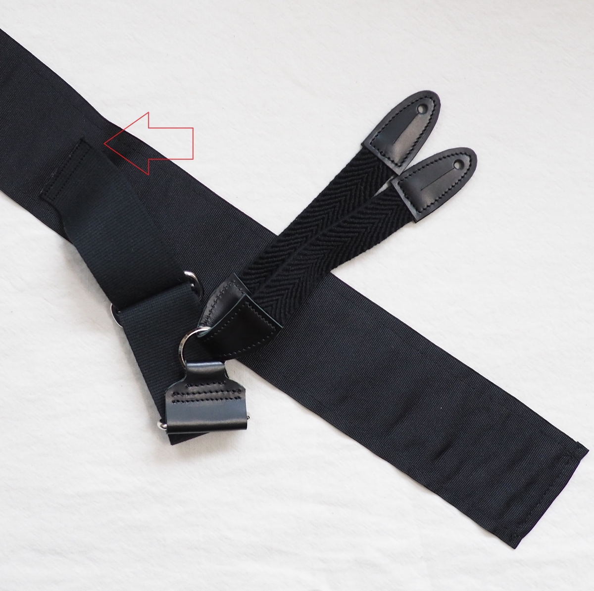 テープエンドはゴム入りのコットンヘリンボーン×レザー。